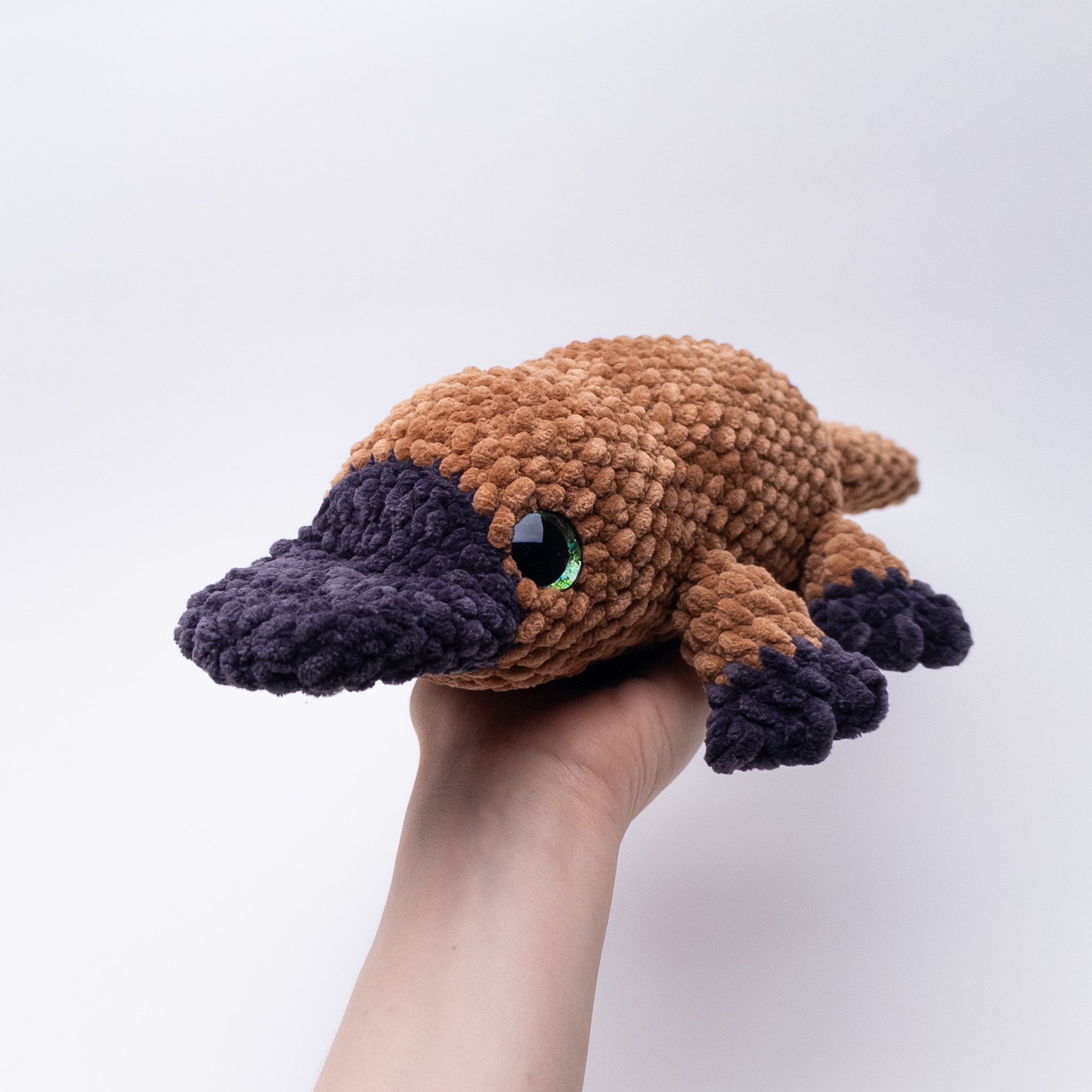 When made with #6 super bulky weight yarn and a 5 mm hook, the finished platypus measures 12.5 inches (or 32 cm) long. When made with #4 medium weight yarn and a 3.75 mm hook, the finished platypus measures 9 inches (or 23 cm) long.