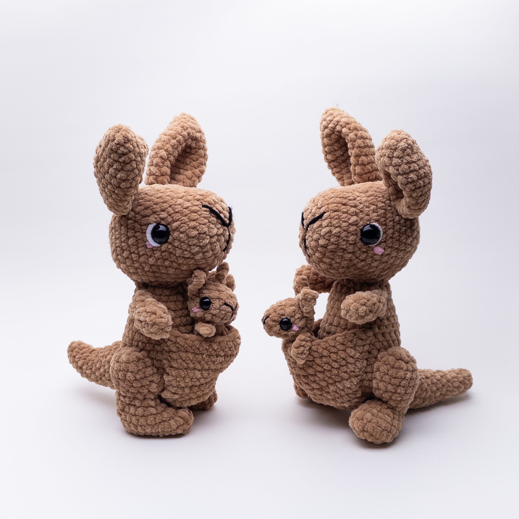 When made with a 5 mm hook and #6 super bulky weight yarn, final measurement for the finished kangaroo is 12 inches (or 31 cm) tall.
