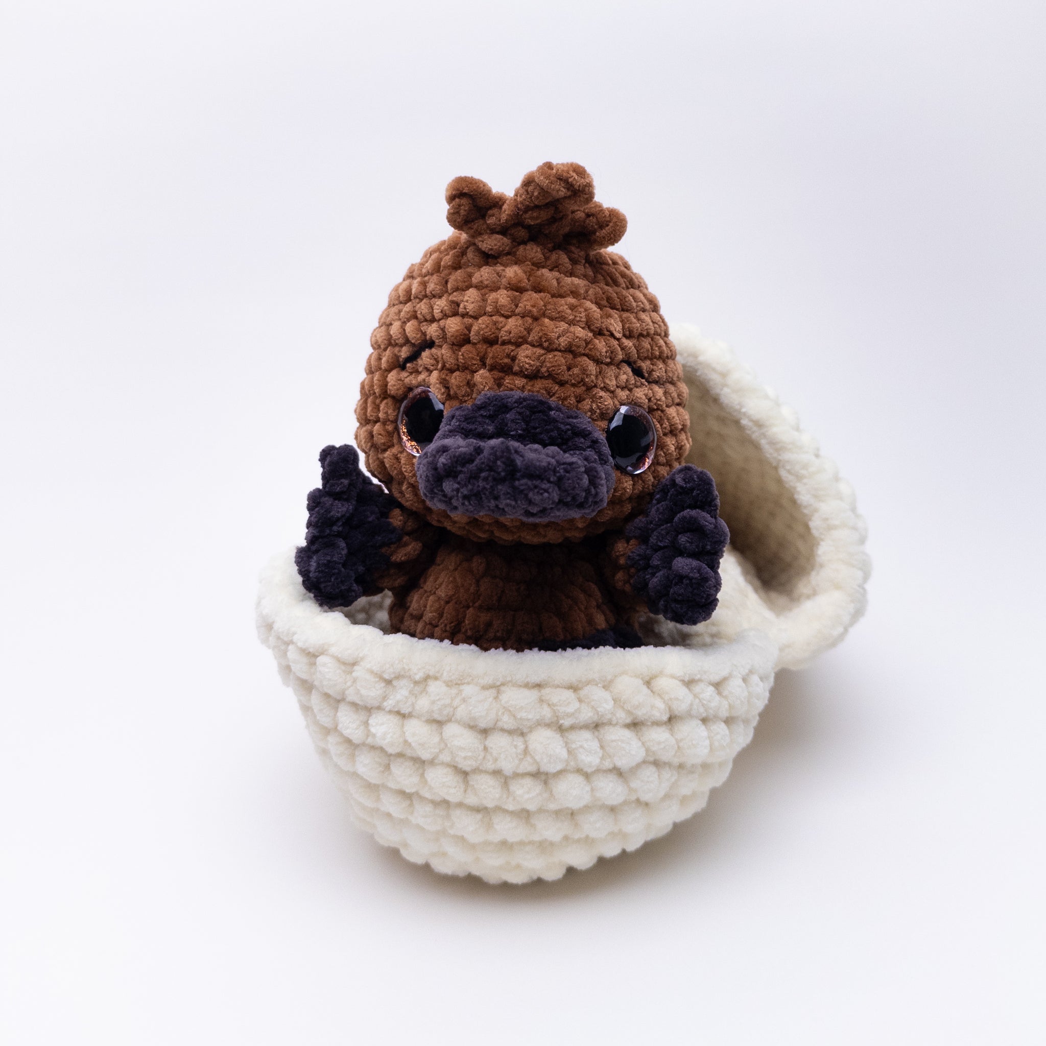 When made with 5 mm hook and #6 super bulky weight yarn, the finished platypus measures 8.5 inches (or 21.5 cm) long.